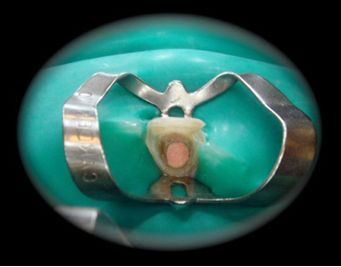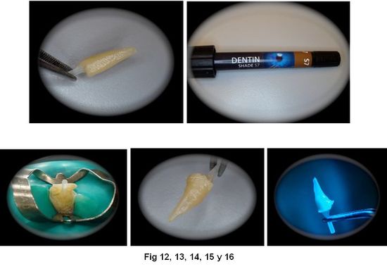8. Cargado de resina envolviendo el poste (Resina Miris 2) y rebasado del mismo buscando mejorar la adaptación del poste a la luz radicular. Fotocurado. (Fig. 12 a 16)