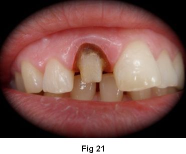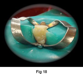 12. Fotocurado durante 60 segundos o más. 13. Reconstrucción de la porción coronaria con (Fig. 19) resina de fotocurado (Miris 2). (Fig. 20)