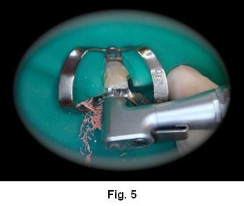 1. Tallado preliminar del conducto con fresas Largo Nº 1 y 2, respetando los 4mm de obturación remanente. (Fig. 5)