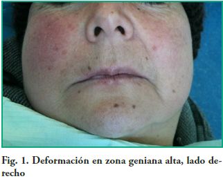 Paciente de 68 años, sexo femenino que consulta en el Servicio de Urgencia de la Facultad de Odontología, Udelar, por tumefacción en zona geniana alta derecha y dolor moderado. Se realiza drenaje intraoral en la zona vestibular a la altura de la pieza dentaria 13 y se indica medicación antibiótica (Amoxicilina 875 mg. cada 8 hs.). La paciente es derivada a la Clínica QuirúrgicaBucomaxilofacial III presentando persistencia de la tumefacción pero sin dolor. Como antecedentes médicos la paciente es hipertensa controlada pero no compensada y con hipercolesterolemia. Es portadora de prótesis completa superior e inferior. Al examen clínico facial se observa deformación del lado derecho de la cara con borramiento del surco naso geniano (Fig.1).