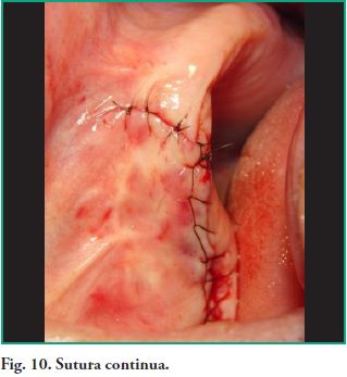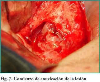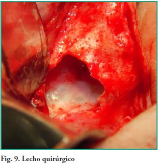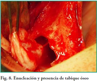 Se procede a hacer ostectomía con instrumental rotatorio y abundante irrigación con suero fisiológico, con la finalidad de agrandar la fenestración para facilitar la visibilidad. Con curetas de elevación sinusal se realiza la eliminación total de la lesión mediante la técnica de enucleación y curetaje, procediendo luego a hacer la exéresis del tabique óseo que divide dicha patología (Figs. 7, 8, 9). Por último se realizó un cierre mediante sutura continua con nylon 5 cero (Fig. 10).