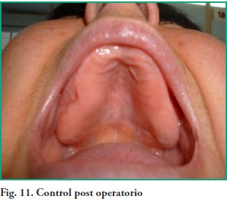 En el post operatorio se indica Amoxicilina 500 mg. cada 8 horas durante 10 días, Ibuprofeno como analgésico y antiinflamatorio a razón de un comprimido de 400 mg. cada 6 horas durante un período de 48 a 72 horas. Como no se realizó contrabertura en el meato inferior se le prescribió gotas nasales con vasoconstrictor para mantener permeable el ostium, facilitando de esa manera el drenaje hasta darle el alta al paciente. A los diez días se retiró la sutura, controlando la evolución cada semana por un período de 2 meses (Fig. 11).