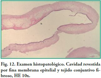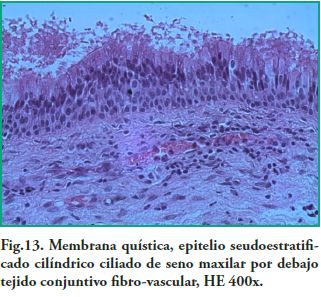 Examen Microscópico: Cavidad quística revestida por membrana fina constituída por epitelio seudoestratificado cilíndrico ciliado (mucosa sinusal), que alterna con zonas de hiperplasia, respaldada por un tejido conectivo fibroso, con zonas edematosas, con abundantes capilares algunos de ellos congestivos y exudados inflamatorios mixtos. El contenido es eosinófilo amorfo con células inflamatorias (linfocitos y plasmocitos) dispersas en un material mucoso (Figs. 12, 13).Discusión