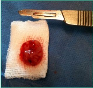 Informe anátomo patológico: Examen Macroscópico: Pieza redondeada de 15x15x4 mm. blanda, blanquecina, al corte contenido sólido gelatinoso amorfo, la membrana externa es fina de 1mm. (Fig. 11-bis).