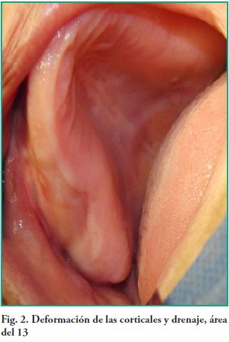Al examen intraoral, en la zona del cuadrante superior derecho presenta ambas corticales deformadas por vestibular, abarcando desde la pieza dentaria 12 hasta la 16 que se extiende hasta el fondo de surco, coincidiendo con el flanco interno derecho de la prótesis superior, realizada hace veinte meses. Cabe destacar que la mucosa que recubre la zona y el reborde son de características normales en cuanto al color y libre de lesiones (Fig. 2). A la palpación, la deformación se presenta dura y firme tanto por vestibular como por palatino. En dicha maniobra se constata un pequeño drenaje coincidente con el tratamiento efectuado previamente en el Servicio de Urgencia.