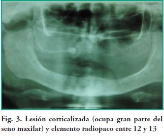 Se establece como diagnóstico clínico: quiste residual y como diagnóstico diferencial: quiste del desarrollo, tumor odontogénico y no odontogénico y mucocele. Se realizan radiografías periapicales, oclusal, teleradiografía de frente con incidencia de Waters y una ortopantomografía. Del conjunto se hace la siguiente lectura: lesión corticalizada con una extensión promedio de entre 25 mm. de alto y 35 mm. de largo, dividida la misma por un tabique. En la porción más posterior existe una ligera fenestración en el piso del seno maxilar. Se constata también un elemento radiopaco a la altura de la pieza dentaria 13 rodeado por un halo radiolúcido nítido (Fig. 3).