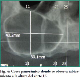 A efectos del diagnóstico y plan de tratamiento se indica una Tomografía Computada (TC), examen realizado a través de adquisición de haz cónico único de rayos X, donde se corroboran las medidas de la lesión de 40.2 mm. en sentido ántero posterior por 30.1mm en sentido vertical. En todos los cortes tomográficos se observa que el seno maxilar derecho está ocupado por una lesión, con un tabicamiento a la altura del 13, que no deforma la pared nasal del seno maxilar (Figs. 4, 5).