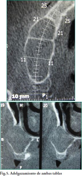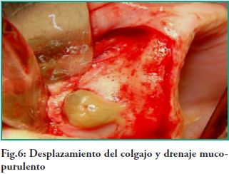 Procedimiento quirúrgico. Mediante la anestesia local correspondiente se procede a realizar una incisión crestal desde la zona tuberosal hasta cerca de la línea media, con una incisión relajante a ese nivel. Previamente a la misma se hizo una punción exploratoria dando como resultado la extracción de un contenido tipo muco purulento. Se elevó un colgajo de espesor total desde adelante hacia atrás, observándose en la zona posterior una fenestración ósea por donde drena abundante contenido mucopurulento (Fig. 6).