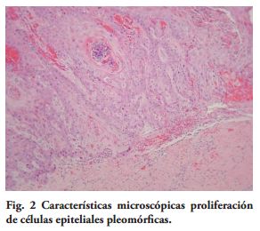 Microscópicamente se reveló una proliferación de células epiteliales pleomórficas, con abundante citoplasma, núcleo hipercromático, nucléolos evidentes, además de queratinizaciones individuales y grupales; y con un conteo mitótico alto, que infiltraban el tejido conjuntivo subyacente (Fig.2).