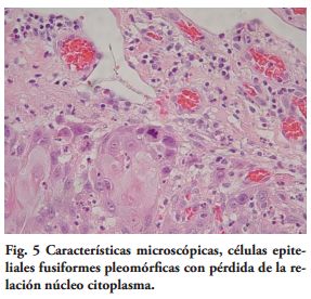 Microscópicamente: el espécimen examinado estaba constituido por una población de células epiteliales fusiformes, pleomórficas, exhibiendo pérdida de la relación núcleo-citoplasma, núcleos hipercromáticos y nucléolos evidentes, así como mitosis abundantes, que infiltran un estroma del tejido conjuntivo fibroso denso bien vascularizado en donde se mezcla con un infiltrado inflamatorio crónico, severo y difuso de predominio linfoplasmocitario, zonas de hemorragia con haces musculares estriados y nervios hacia la base. Cubriendo parcialmente el espécimen se encuentra un epitelio escamoso estratificado paraqueratinizado con áreas de solución de continuidad estableciendo un diagnóstico de carcinoma de células escamosas moderadamente diferenciado (Fig.5).
