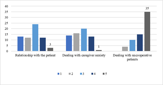 Regarding the degree of difficulty faced when seeing PSN, students responded on a scale from 1 to 5 (from least to most difficulty) and stated that their biggest problem was dealing with non-cooperative patients (Chart 1).