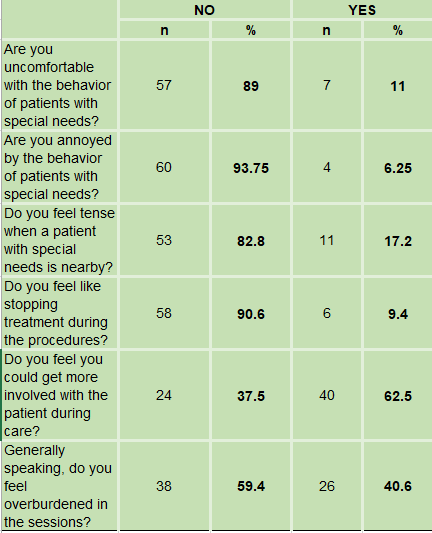 The questionnaire had 20 questions related to the feelings and degree of difficulty they faced in terms of procedures and types of patients; as well as the experiences, bonds and relationships they forged with the PSN and their caregivers. They also asked about the biggest challenge and their perception of the discipline of dental care for patients with special needs.