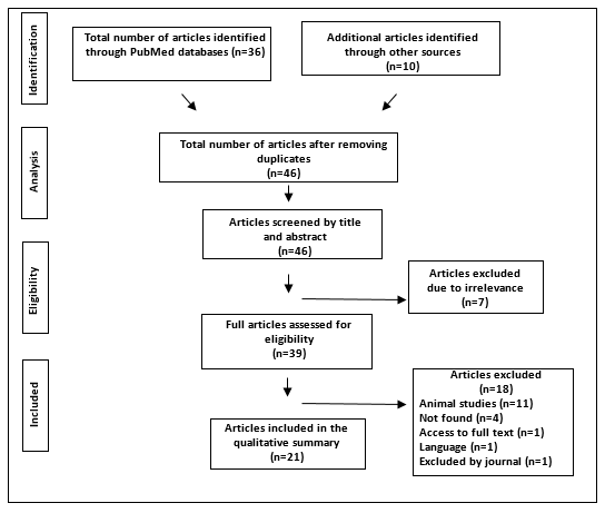 Thirty-six studies were obtained. Ten studies identified through searches in other sources were also added to this search. Forty-six articles were collected in the entire search, seven of which were excluded for not being related to the subject matter. Out of all the articles selected, those which did not meet the inclusion criteria were excluded, 11 of them because they were about animal studies, 4 could not be found, 1 because the full text could not be accessed, 1 due to the language and 1 was withdrawn by the journal after publication. The total number of studies analyzed in this review was 21, as shown in Figure 1.