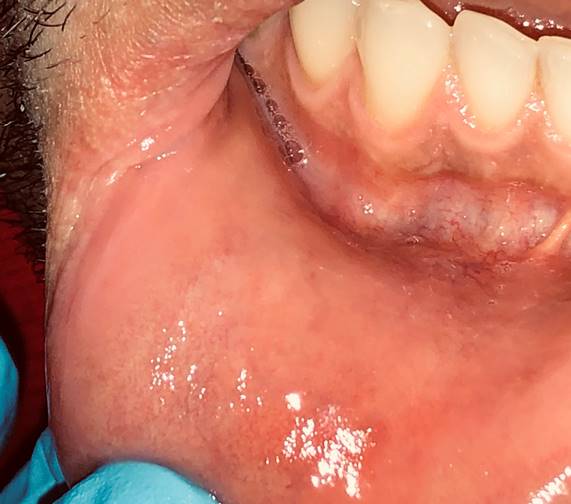 A 31-year-old Nicaraguan male deprived of liberty is brought to the School of Dentistry of the University of Costa Rica (UCR) with the main complaint of lower lip injury of approximately two months of evolution. He does not report a history or systemic contraindications in the direct interview. He currently does not take any medications. He states that he is a chronic smoker: 30 cigarettes a day from the age of 16. When asked about his sexual activity, he reports being single, bisexual, and having had unprotected oral sex with males.