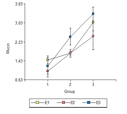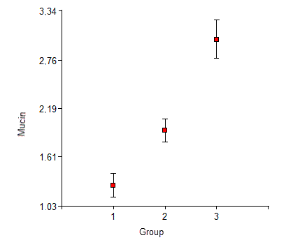 The analysis of variance and subsequent F test (F = 25.01, p < 0.0001) confirm significant differences in mucin content. The results of Duncan’s test (Table 1) show that the mean mucin contents in Group 1 are lower than in the other two groups and that those of Group 2 are lower than those of Group 3.