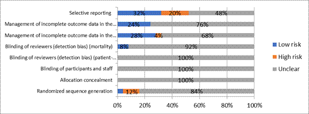 Assessing risk of bias. The risk of bias of each article was assessed according to The Cochrane Collaboration (2011) guideline: 32% of the articles were low risk for “reporting bias,” while 20% of the studies were of high risk, and 48% had unclear risk (Fig. 2). The degree of bias was classified as low risk if all criteria were met, moderate risk if only one criterion was missing, and high risk if two or more criteria were missing.