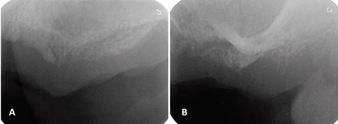 (A) Loss of bone density with a poorly defined radiolucent area. (B) Loss of bone trabeculation and of continuity of the bone ridge, with irregular radiolucent and radiopaque areas.