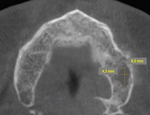 Cross-section showing an osteolytic area on the left side of the maxilla measuring 8.5 mm x 4.3 mm is observed.