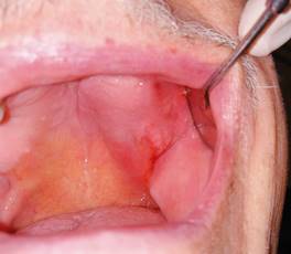Fig. 2: Intraoral view of lesion on the left side of the maxilla with bleeding and inflammation of the surrounding tissues.