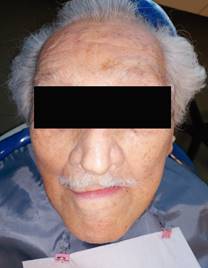 The first clinical examination found no evidence of facial asymmetries or volume increase (Fig. 1). The patient was completely edentulous and had a linear discontinuity at the mucosa of the left maxillary alveolar ridge of approximately 1 cm in diameter. It extended from the edentulous region of teeth 2.5-2.7 to the maxillary tuberosity. Clearly delimited lesion, with abundant bleeding and purulent exudate. Large edema and erythema of the surrounding soft tissues were also observed (Fig. 2). Communication with bone tissue was confirmed by probing the lesion and removing the remaining necrotic bone tissue and abundant hematic content (Fig. 3 A, B).