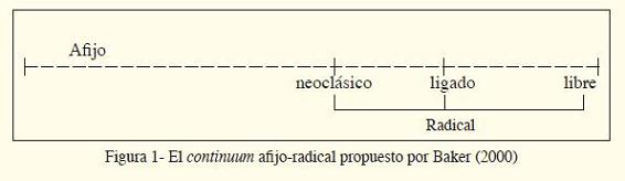 Por otro lado, los elementos neoclásicos actualizan significados que son más lexicales, o, en palabras de Préié (2008: 322), ''tienen una mayor densidad semántica'' (trad. nuestra). Para Ralli (2008: 156), la clase de los radicales (incluyendo los neoclásicos) ''tiene un significado concreto si se les compara a los afijos, que tienen un papel más funcional (categorial o relacional) o tienen un significado más abstracto'' (trad. nuestra). Si tenemos tal dato en cuenta, radicales neoclásicos se fijan, en el continuum propuesto por Baker (2000), entre los afijos y los radicales ligados, como la siguiente representación en la figura 1: