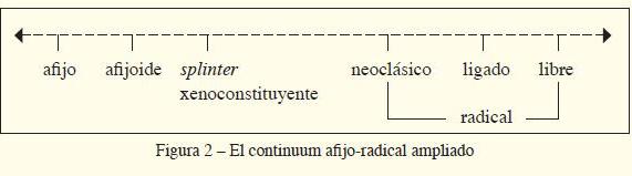 Como ya se señaló en la introducción, pretendemos ampliar el continuum formalizado en la figura (1), ya que el portugués actual presenta varios componentes morfológicos que podrían ser colocados en esta escala al compartir las propiedades de los radicales y de los afijos. En la siguiente sección, describimos y analizamos cada tipo de elemento referido en la introducción: afijoide, splinter y xenoconstituyente.