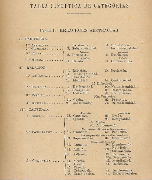 A esta clasificación general de las categorías principales sigue una Tabla sinóptica de categorías en la que se desglosa pormenorizadamente los contenidos de aquella. Ofrecemos a continuación la primera página de la Tabla: