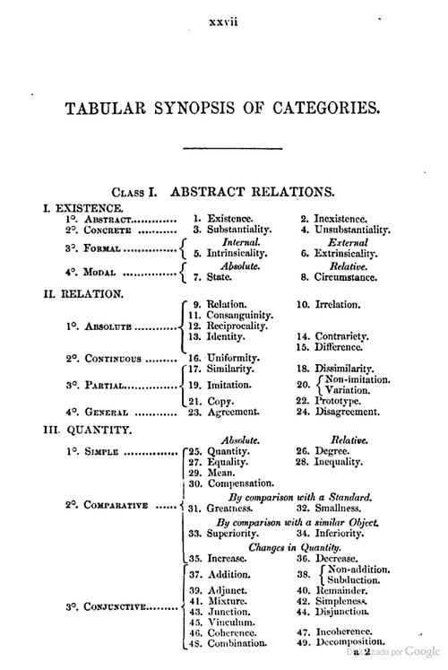De forma similar, la clasificación genérica de los conceptos que figura en el Diccionario sigue la Tabular sinopsis of categories de la obra de Roget. Adjuntamos análogamente la primera página de la tabla: