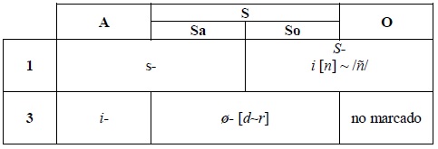 Por otro lado, la 1º persona gramatical presenta intransitividad escindida (Split-S), en este sentido, A=Sa y O=So. Mientras que el comportamiento de la 3º persona gramatical no ha podido sistematizarse satisfactoriamente hasta el momento. A falta de una descripción más acabada, se asume la propuesta de Gualdieri (1998) con modificaciones mínimas. A continuación se detalla el sistema de marcación pronominal para la 1º y la 3º persona gramatical.