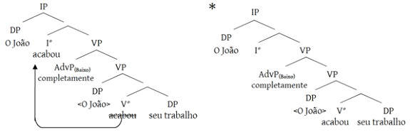 Desde Pollock (1989), assume-se que os advérbios baixos ou AdvPs de VP (‘left-edge adverbs’) seriam diagnósticos para a subida do verbo à flexão, pelo simples fato de se adjungirem ao VP e poderem, portanto, indicar se o V teria ou não saído do VP (cf., dentre outros, Pollock 1989; Galves 1993, 1994; Figueiredo Silva 1996; Costa 1998, 2004; Cinque 1999, 2004; Laenzlinger 2002; Laenzlinger & Soare 2005; Modesto 2000; Cyrino 2011). (1-2) a seguir ilustram a validade de tal diagnóstico. Como se sabe, não há movimento de V à flexão em inglês (Pollock 1989; Belletti 1990; Chomsky 1995). Assim, o advérbio de VP completely 'completamente' deve encontrar-se necessariamente à esquerda do V (1a); (1b) é agramatical porque o particípio moveu-se por sobre o advérbio. No português do Brasil (doravante PB), para o qual, como se sabe, há movimento do verbo (cf. Galves 1993, 1994; Figueiredo Silva 1996; Cyrino 2011), V deve posicionar-se à esquerda do AdvP: (2b) é gramatical por sugerir tal movimento; (2a), que sugere a ausência do movimento de V à flexão, é agramatical.