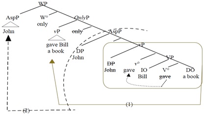 [8] Há evidência morfossintática para a assunção desse núcleo atrator K em Sintaxe, toda a vez que um elemento associado a escopo (p.ex., advérbios focalizadores, advérbios em geral, etc) entra na derivação. Segundo Shu (2011: 132), há, em mandarim, um marcador de concordância, CAI, que pode aparecer com um advérbio focalizador.: