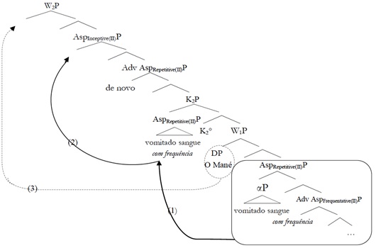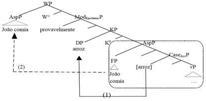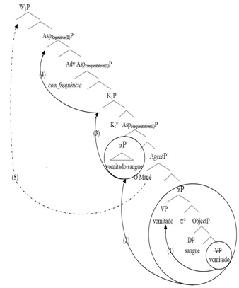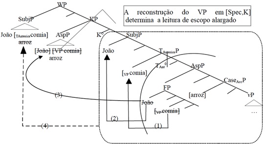 Assumimos, com Koopman & Szabolcsi (2000), Cinque (2005, 2007), Kayne (2005), dentre outros, que a Gramática Universal permite apenas movimentos sintagmáticos e não dá lugar a movimentos nucleares. Chomsky (2001) já havia avançado tal ideia no tocante ao movimento de V à Flexão, relegando o movimento nuclear ao componente fonológico (PF) da Gramática.[4]