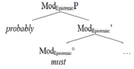 Cinque oferece mais evidências para a ordenação dos núcleos funcionais (cf. Cinque 1999, capítulo 3) para, ao final, mostrar que os advérbios se assemelham aos núcleos funcionais em termos de número, ordem relativa e classes semânticas. A conclusão do autor é que os advérbios ocupam uma posição de especificadores únicos de núcleos funcionais distintos. Assim, no caso da modalidade epistêmica, tomando como exemplo o inglês, o advérbio probably, se presente na numeração, ocuparia a posição de Spec do modal must 'poder', em seu uso epistêmico, conforme ilustra a figura 3, a seguir.