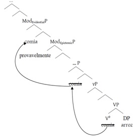 Há razões para preferirmos tal derivação às derivações alternativas propostas na literatura por Nilsen (2004), Laenzlinger (2011) e Zyman (2012). Nilsen propõe uma saída 'cartográfica' ao problema da derivação de sentenças como (24), sugerindo que o único modo de derivá-la num sistema como o de Cinque (1999) seria propondo uma outra projeção para a modalidade epistêmica muito próxima ao vP. O sistema de Laenzlinger (2011) derivaria (24) a partir do movimento de V por sobre o AdvP (de maneira semelhante àquela sugerida na fig. 4 e texto correspondente). Zyman (2012) entende que, para casos como o de (24'a), o AdvP seria adjungido diretamente ao NP-complemento do verbo. As análises de Nilsen, Laenzlinger e Zyman apresentam no entanto um sério problema empírico, que a análise aqui proposta não apresenta: de acordo com as derivações desses autores, em sentenças como (35), o AdvP deveria ser recuperado pelo VP elíptico no segundo elemento da coordenação, contrariamente aos fatos: ver a agramaticalidade de (35b) e (36b), que mostram que o advérbio provavelmente não é jamais recuperável pelo VP-elíptico. Tal fato sugere que o V se encontra numa posição necessariamente mais baixa que a do AdvP.