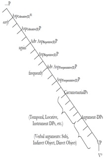 Assumimos também, com Cinque (1996) e trabalhos subsequentes, o que este autor denomina de assimetria dos lados direito e esquerdo ("left-right asymmetry") das línguas naturais. Segundo tal proposta, no tocante à projeção estendida do V (ou oração), V seria o primeiro elemento a entrar na derivação e projetaria o VP (sem ter um complemento ou especificador). Os argumentos, os complementos circunstanciais e os advérbios de diferentes classes entrariam na derivação em posições acima de V(P), conforme o esquema apresentado na figura 5, a seguir (de Tescari Neto 2013: 109).