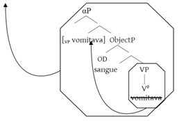 [11] Nas representações dadas nas figuras 11 e 12, estamos simplificando os primeiros passos da história derivacional de (24). Nesse sentido, 'pulamos' a inserção do V e a Soldagem do argumento interno e do argumento externo em posições acima de V, bem como o movimento de V por entre cada uma dessas posições. Não representamos também o movimento do objeto ao especificador do núcleo atribuidor de caso acusativo (naturalmente em um Spec acima de vP), colocando o objeto já naquela posição. Sujeito e VP aparecem no especificador acima do objeto devido ao movimento do remanescente que se dá nesse tipo de derivação Kayneana em que todas as vezes que um DP sobe para checar caso há sempre na sequência um movimento do material remanescente. Para mais detalhes sobre esse tipo de derivação, ver Kayne (2000, 2005) e Cinque (2006, capítulo 6). Para uma aproximação à sintaxe do PB, ver Tescari Neto (2013).