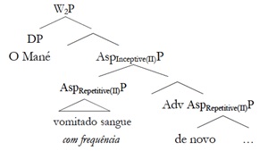 [francamente ModoAto de fala > [surpreendentemente ModoMirativo> [felizmente ModoAvaliativo > [evidentemente ModoEvidencial > [provavelmente ModalidadeEpistêmica > [uma vez TPassado > [então TFuturo > [talvez ModoIrrealis > [necessariamente ModalidadeNecessidade > [possivelmente ModalidadePossibilidade > [normalmente AspHabitual > [finalmente AspTardivo > [tendencialmente AspPredisposicional > [novamente AspRepetitivo(I) > [frequentemente AspFrequentativo(I) > [de/com gosto ModalidadeVolitiva > [rapidamente AspAcelerativo(I) > [já TAnterior > [não … mais AspTerminativo > [ainda AspContinuativo > [sempre AspContínuo > [apenas AspRetrospective > [(dentro) em breve AspAproximativo > [brevemente AspDurativo > [(?) AspGenérico/Progressivo [quase AspProspectivo > [repentinamente AspIncoativo(I) > [obrigatoriamente ModoObrigação > [em vão AspFrustrativo > [(?) AspConativo > [completamente AspSingCompletivo(I) > [tudo AspPlurCompletivo > [bem Voz > [cedo AspAcelerativo(II) > [do nada AspIncoativo(II) > [de novo AspRepetitivo(II) > [frequentemente AspFrequentativo(II) > … (Cinque 1999: 106, modificada em Cinque 2006)