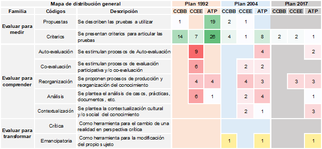 La lectura inicial de los programas en esta primera etapa incluyó dos procedimientos. El primero consistió en agruparlos en torno a tres áreas de conocimiento que estructuraban la malla curricular en los planes 1992 y 2004: área de las ciencias biológicas (CCBB), área de las ciencias de la educación (CCEE) y área técnico-profesional (ATP). Los programas del Plan 2017 se adaptaron a la organización por áreas -abandonadas a partir de su aparición-,3 ajuste que permitió realizar un análisis transversal de los componentes de los tres planes enfatizando la lectura desde las cercanías disciplinares. El segundo supuso catalogar su contenido en función de tres categorías teóricas estructuradoras predominantes en materia de evaluación en educación física, que constituyen las tres familias de códigos para el análisis de contenido: