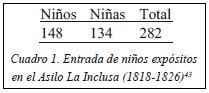 Persiguiendo el objetivo de dar visibilidad a esta población infame, analizaremos algunas cifras que fueron registradas en: actas y solicitudes de adopción, y cartas donde se documentaron las entregas de niños. Se han presentado dificultades a la hora de separar muestras temporales representativas, por la inexistencia de una continuidad de la documentación 42. Los niños que llegaban al Asilo lo hacían básicamente de dos formas: entregados en manos (por familiares, vecinos, jueces, policía) o a través del Torno, depositados por parteras, vecinos, familiares o desconocidos. La “partida” de estos niños también fue registrada y ésta podía darse a través de cinco vías: por la adopción; por el reclamo de sus padres biológicos o parientes, presentando la contra seña o señal (objeto dejado junto al niño para posterior identificación); dados en custodia ya sea a un “ama de leche” o “ama de leche seca”, o a algún familiar; por muerte; y por último a través de la emancipación (por mayoría de edad en caso de los hombres y por casamiento en el caso de las mujeres). En el estudio del proceso de adopciones se pudieron visualizar algunas variables interesantes como tiempo de espera entre la solicitud de adopción y el definitivo otorgamiento del niño/a, edades y sexo preferidos para la adopción, también se puede considerar el estado civil de los solicitantes. A partir del análisis de estos elementos podremos aproximarnos a los que significaban las prácticas de adopciones durante el siglo XIX. Desde la fundación de la Inclusa (1818) hasta el año 1826, la historiadora Diana Bianchi muestra, a través del siguiente cuadro, la división por sexo del orfanato: