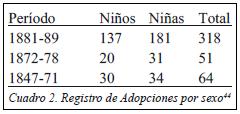 Dentro de los Registros de Adopciones, desde el período de enero de 1881 hasta diciembre de 1887 encontramos que 318 niños/as fueron adoptados, lo que muestra un gran crecimiento de las prácticas de adopciones si lo comparamos en los períodos anteriores. En el siguiente cuadro realizamos la división por sexo en las adopciones del período 1881-89, comparado a los períodos de 1847-71 y al de 1872-1878. Los recortes temporales están hechos a partir del material encontrado.
