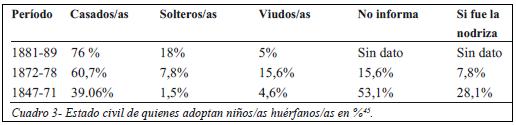 Si a estas cifras las comparamos con la división por sexo de admisiones en el Asilo, que comentamos anteriormente (ver cuadro 1), donde primaban los niños sobre las niñas, vemos que se acentúa la preferencia de adoptar niñas sobre niños. Veamos ahora otro cuadro según el estado civil de quienes solicitaban las adopciones.