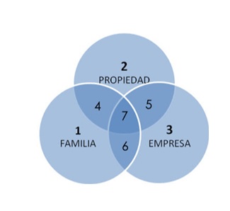 Derivado lo anterior del modelo que predomina el estudio de estas empresas, con la Teoría de los Tres Círculos de Renato Tagiuri y John Davis que explican a través de estos círculos la forma en la que se sobreponen las estructuras de un sistema familiar de empresa y como interaccionan los elementos compositivos de la misma en relación al acomodo y dinámica de estos tres círculos, el modelo visualiza diversas áreas que se superponen en atributos o características positivas o negativas dependiendo de la gestión de las empresas familiares y el ecosistema donde interactúan. Constituye uno de los elementos esenciales de orientación y continuidad para los emprendimientos de familias empresariales (Alcántara Mesías, 2017). (Figura 2)