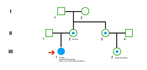 Dado que se trata de un fenotipo heterogéneo y del que se podían plantear algunos diagnósticos diferenciales ante la presentación leve de la enfermedad (fundamentalmente con formas genéticas de oligodoncia o dentinogénesis imperfecta) se recurrió a la secuenciación de exoma mediante secuenciación masiva de reads cortos, lo que permite analizar todos los genes potencialmente implicados en el fenotipo: se detectaron 2 variantes en el gen EDA(NM_001399.4): c.739C>G;p.(Gln247Glu) y c.741+1G>A, ambas en heterocigosis y formando parte de un mismo haplotipo (en cis). En nuestra paciente el gen EVC2 no fue analizado.