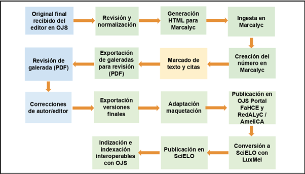 Fuente: Elaboración propia. Nota: En celeste, tareas realizadas por editores; en verde, por profesionales del equipo técnico de edición; en amarillo, por bibliotecarias externas al equipo técnico