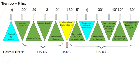 Los costos reflejados en la figura 3 han evolucionado desde las primeras estimaciones de tiempos en la indización de las revistas (Rozemblum, et al., 2014). A partir de la identificación del esfuerzo puesto en el marcado XML-JATS desagregado para SciELO, se comenzó a buscar alternativas para el cambio en el flujo de trabajo en las que el XML-JATS fuese el primer paso. La posibilidad de utilizar Marcalyc de Redalyc-AmeliCA nos proporcionó este primer paso y, en consecuencia, la optimización de los tiempos en relación con los resultados. Luego, en consecutivas y diversas presentaciones en reuniones científicas, se fueron ajustando los datos de tiempos y costos, especialmente por la variación peso/dólar, recurrente en Argentina. De todas maneras, los cálculos siempre se han hecho con respecto a las horas de los recursos humanos participantes en cada tarea y los costos que para la institución significaban los salarios de estos profesionales de la información y la comunicación: bibliotecarios, diseñadores e informáticos (Banzato & Rozemblum, 2019; Rozemblum & Banzato, 2019). Además, hay que sumar tres tareas. Una previa al «original del editor» que comienza el proceso de edición, que es la corrección de estilo, que podría costar entre USD 40 y USD 100 según el tamaño del documento y el idioma (castellano o portugués). Las otras dos para culminar el proceso indicado en la figura 2, la conversión a SciELO con LuxMel y la indización en bases de datos, posteriores a la «publicación en portal propio» de la figura 3, que pueden implicar unas tres horas y USD 100 más. Debe aclararse que no hay maquetación para papel, por lo tanto, no se utiliza el software (por lo que no hay que pagar regalías) ni se pagan esos honorarios. En total, todo el proceso técnico de gestión de contenidos tiene un costo de entre USD 250 y USD 310 por artículo.