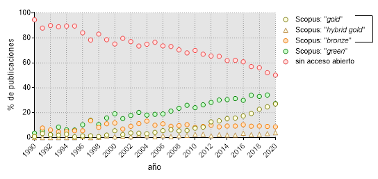 En lo que respecta al tipo de acceso abierto, Scopus establece las siguientes categorías: gold (‘ruta dorada’), hybrid gold (‘ruta híbrida’), bronze (‘ruta de bronce’) y green (‘ruta verde’). Estas categorías están definidas sobre la base de las definiciones proporcionadas por Unpaywall (www.unpaywall.org), un directorio que busca versiones abiertas de los artículos en internet. En particular, es importante señalar que en la categoría gold se incluyen tanto artículos publicados con licencias liberales que no cobran APC (es decir, ruta diamante) como artículos que sí cobran APC. Por otro lado, en la categoría green se encuentran artículos para los cuales Unpaywall pudo hallar una versión legal, libre y gratuita en internet, incluyendo repositorios de acceso abierto. Mientras que las categorías gold, hybrid gold y bronze son mutuamente excluyentes, cualquiera de ellas puede tener superposición con la categoría green. Esto fue debidamente considerado cuando se realizaron sumas o restas.