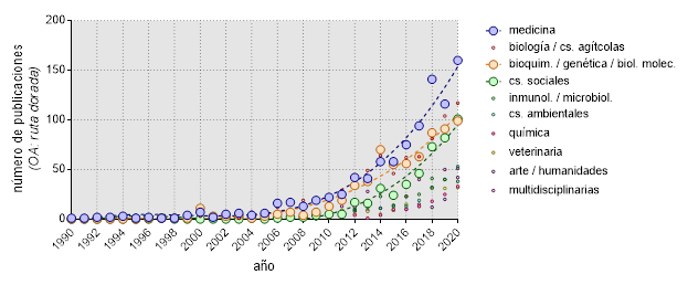 Uno podría preguntarse si el rápido crecimiento de los artículos publicados en revistas basadas en la ruta dorada (con o sin pago de APC) ocurre debido a un cambio en la modalidad de publicación en ciertas disciplinas específicas o si es un fenómeno común a todas las áreas del conocimiento. En el v 2 se grafica la variación anual en el número de artículos publicados en la categoría gold de Scopus, desagregados ahora por disciplinas. Incluso entre áreas del conocimiento que pueden tener distintas modalidades en la forma de comunicar sus resultados de investigación, la tendencia a un fuerte aumento en la última década de este tipo de publicaciones se mantiene incambiada. Se destacan tres disciplinas que fueron ajustadas a un polinomio de orden tres a los únicos efectos de facilitar la visualización de las tendencias.