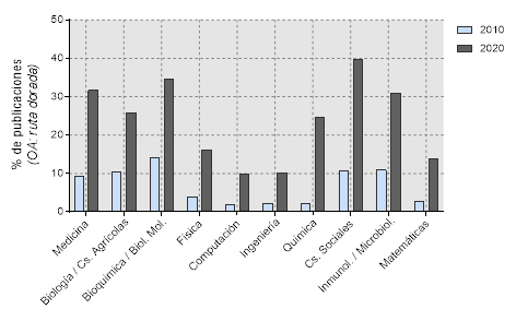 Para evaluar la variación temporal en el peso relativo de las publicaciones de acceso abierto por ruta dorada en cada área del conocimiento, se seleccionaron las diez disciplinas que producen mayor cantidad de artículos totales (con autores de filiación en Uruguay) y se determinó el porcentaje de estas que corresponde a artículos bajo la categoría gold en los años 2010 y 2020 (ver Figura 3). Si bien la popularidad de esta categoría varía entre áreas del conocimiento o disciplinas, en todos los casos se constató al menos una duplicación en la última década. El caso extremo es química (2,1 % en 2010 versus 24,6 % en 2020).