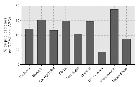 Llamativamente, se observaron diferencias importantes entre áreas del conocimiento en el porcentaje de revistas incluidas en DOAJ que cobran APC (ver Figura 4). Por ejemplo, dentro de esta base de datos, el cobro de APC es relativamente infrecuente en ciencias sociales (17,7 %), pero muy común en revistas de química o biología, en las que puede llegar a representar hasta un 75,5 % del total de revistas de acceso abierto incluidas en DOAJ.