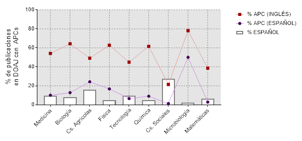 ¿Por qué existe una asociación tan fuerte entre acceso abierto por ruta dorada y cobro de APC en algunas disciplinas y una disociación marcada de ambos conceptos en otras? Una observación interesante es que este fenómeno está fuertemente asociado al idioma. En el Gráfico 5 puede observarse cómo, independientemente de la disciplina o del área del conocimiento, las revistas indexadas en DOAJ que publican en idioma inglés tienden a cobrar APC en proporciones mayores (en torno al 50 %, curvas rojas) que las revistas indexadas en DOAJ que publican en idioma español (en torno al 10 %, pero con mayores fluctuaciones, curva violeta). Más aún, en aquellas áreas del conocimiento donde existe una proporción mayor de revistas que publican en español (tales como ciencias sociales, en las que el número de revistas en español en DOAJ llega a ser el 27,4 % del total, barras blancas), el cobro de APC es prácticamente inexistente en las revistas en español y está también muy por debajo de la media en las revistas que publican en inglés. Por el contrario, casi todas las revistas de microbiología publican en idioma inglés y, de las pocas que publican en español, el 50 % cobra APC.